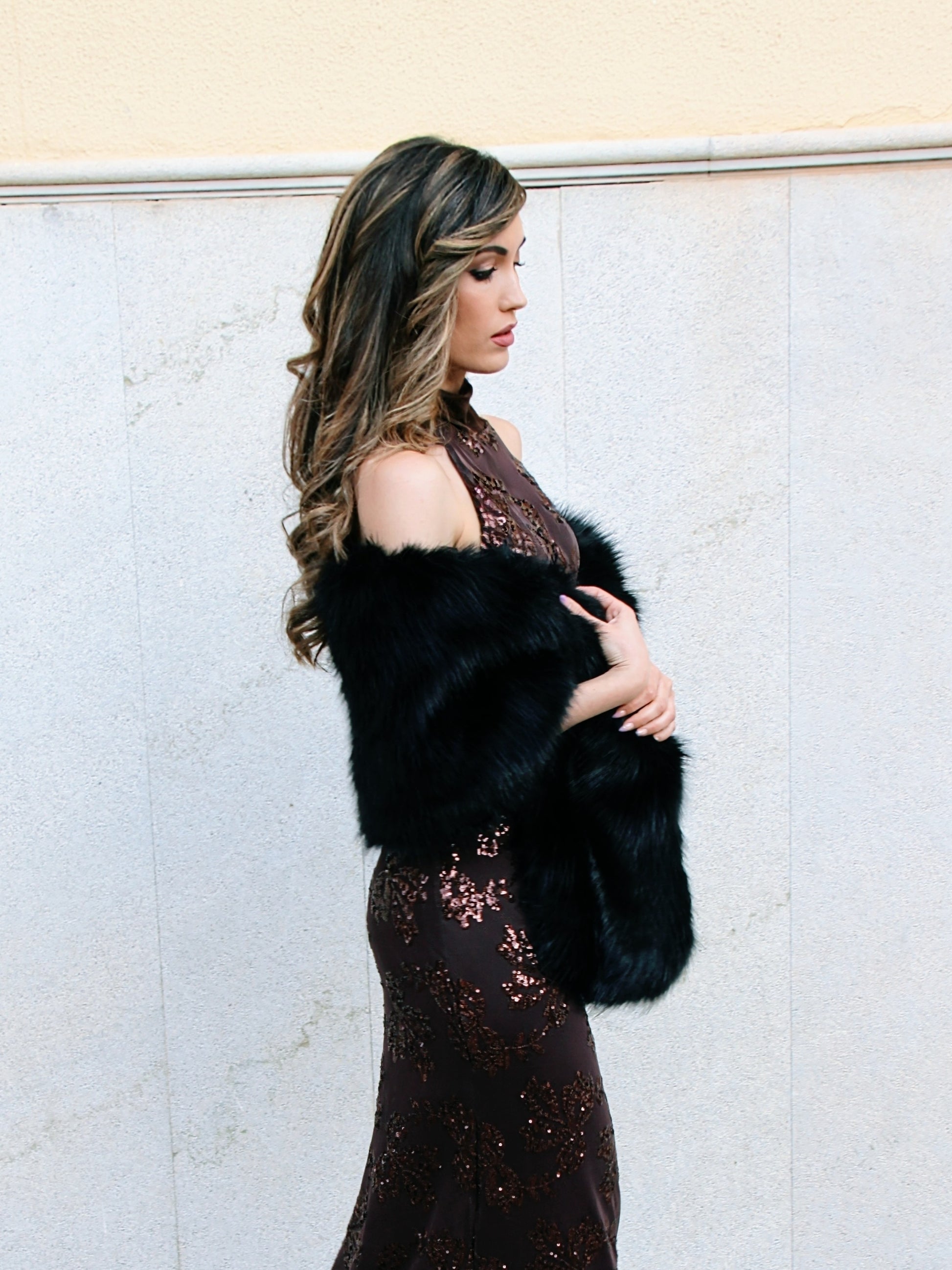 Estola de pelo negra con gancho, para poder llevarla cómodamente cerrada o abierta.