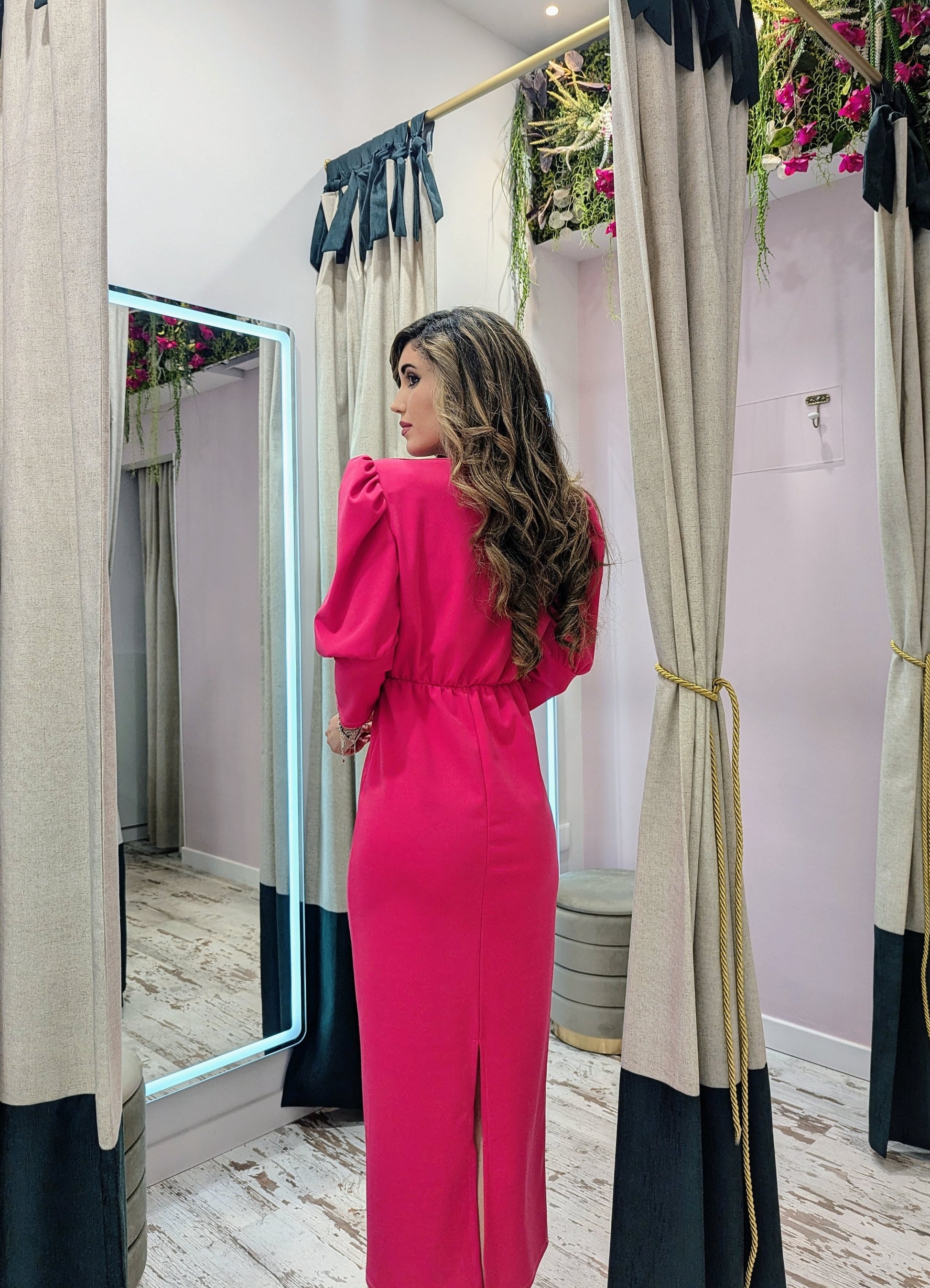 Vestido midi de cintura alta elástica, escote en V y manga francesa abullonada. Su tono rosa Barbie lo dota de elegancia y frescura. Talla única elástica (36/38).